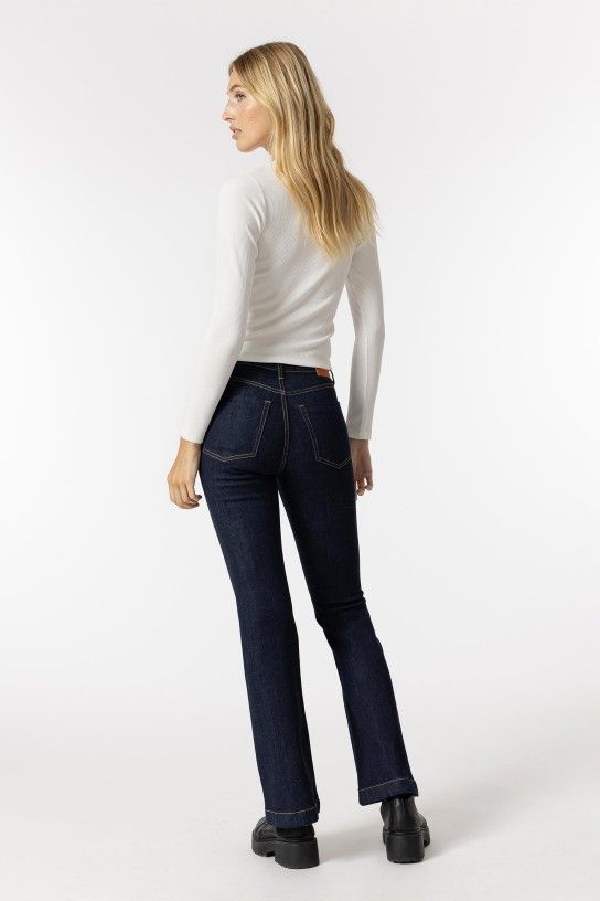 - Vaqueros de Campana: Ajustados en las caderas y muslos, se ensanchan desde la rodilla para un look retro y estilizado.