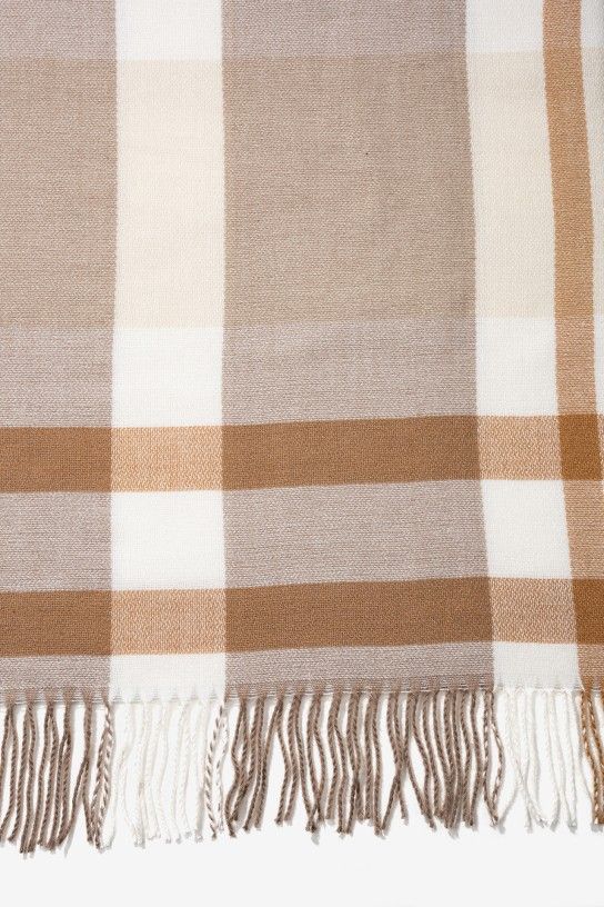 bufanda en tonos beige y blanco con estampado de cuadros y flecos en los extremos. 100% POLYESTER