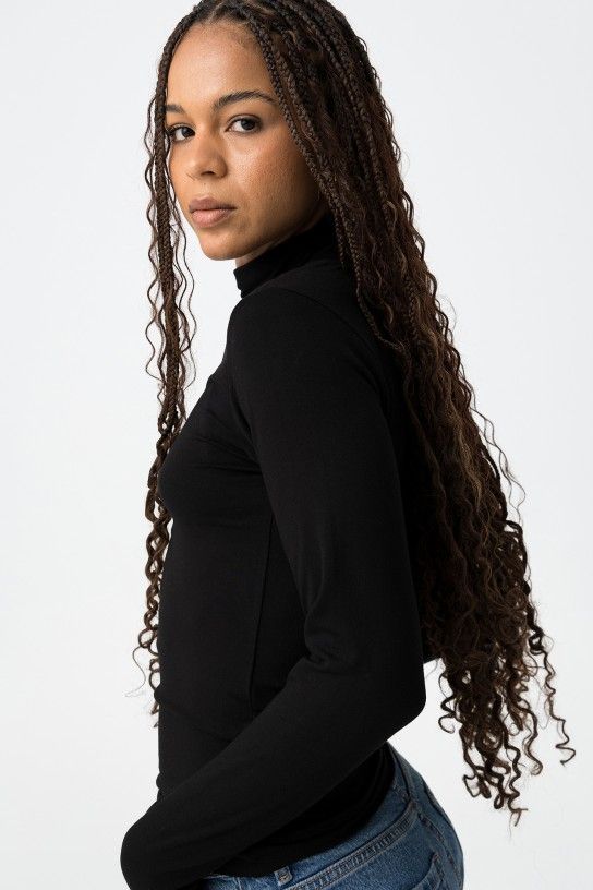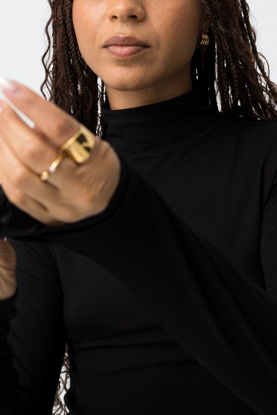 Camiseta ajustada de color negro, con mangas largas y cuello alto para un estilo minimalista. 95% VISCOSE 5% ELASTANE