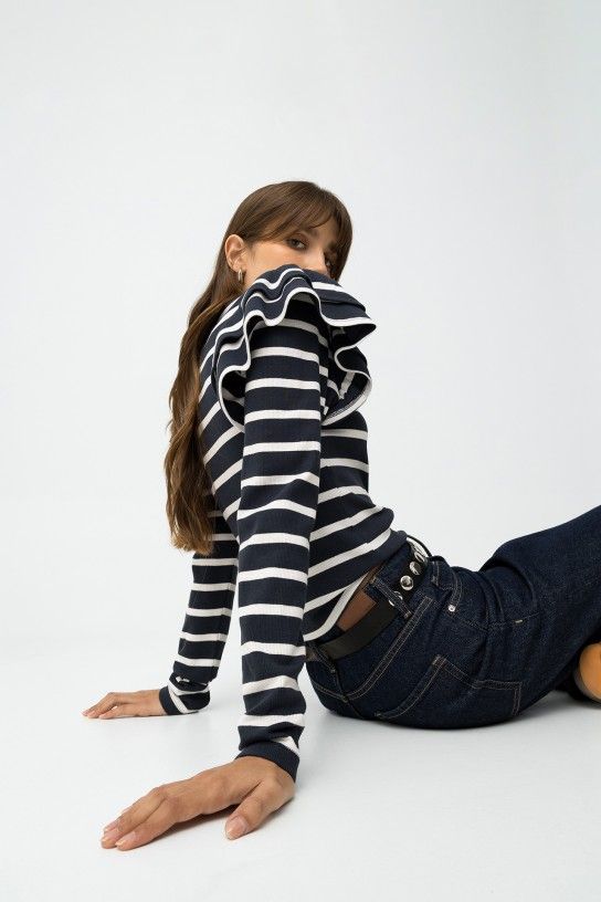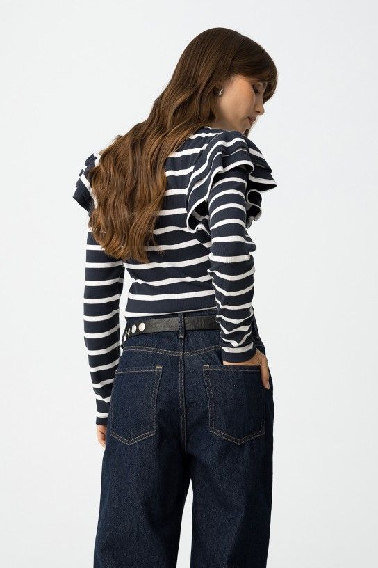 Camiseta slim fit de canalé a rayas, con volantes en los hombros, escote redondo y manga larga.