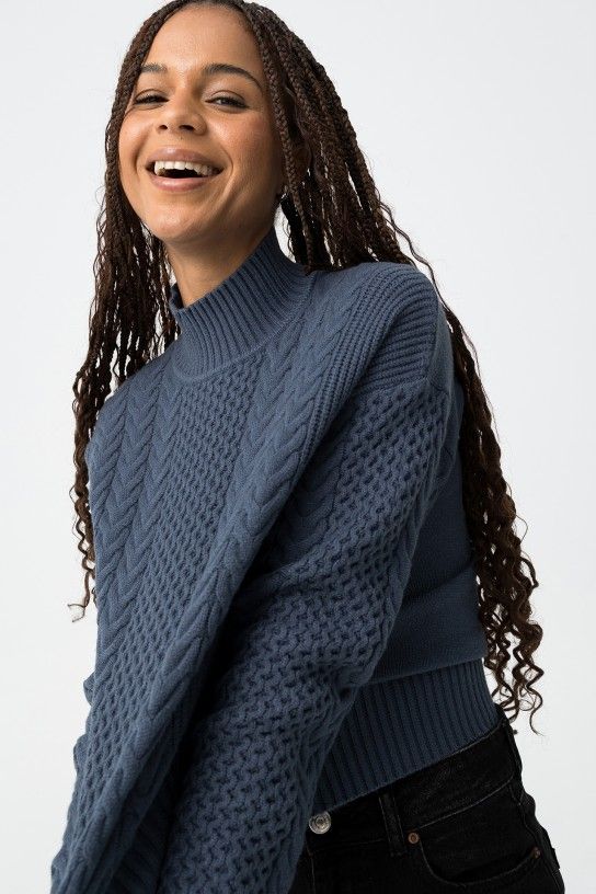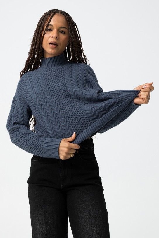 Jersey regular fit de punto trenzado, cuello alto, manga larga y acabados de canalé. 52% VISCOSE 28% POLYESTER 20% POLIAMIDE