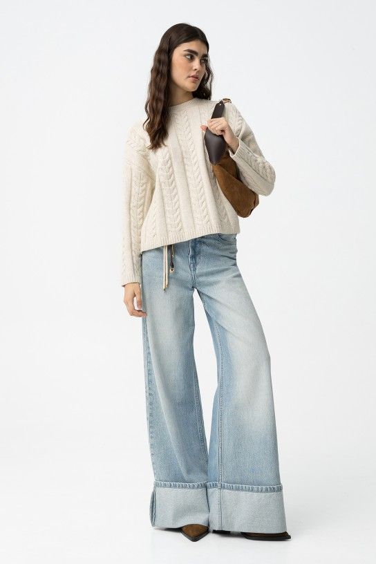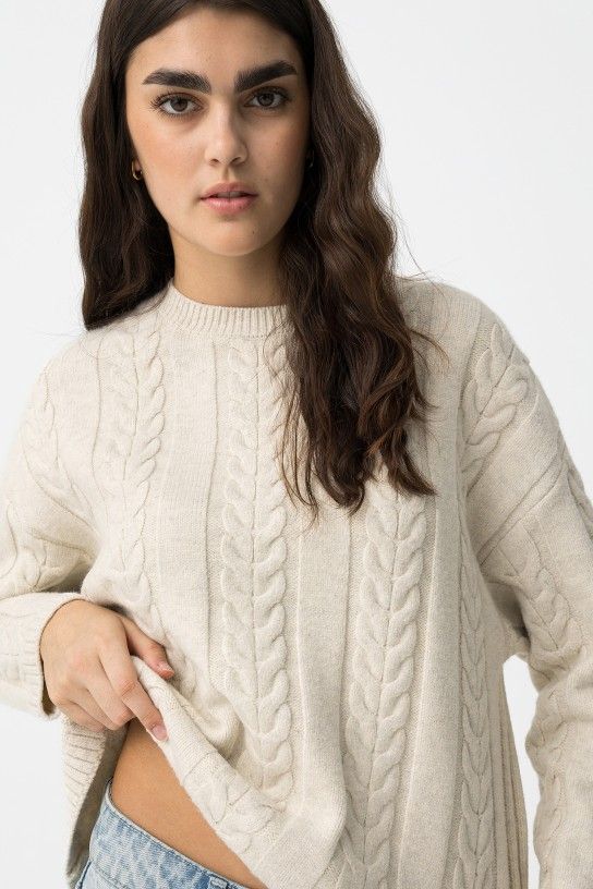 Jersey de punto grueso con patrón de trenzado delantero y en mangas. Silueta oversize con cuello redondo, hombros caídos y acabados en punto canalé. 75% POLYESTER 15% ACRYLIC 10% POLYAMIDE
