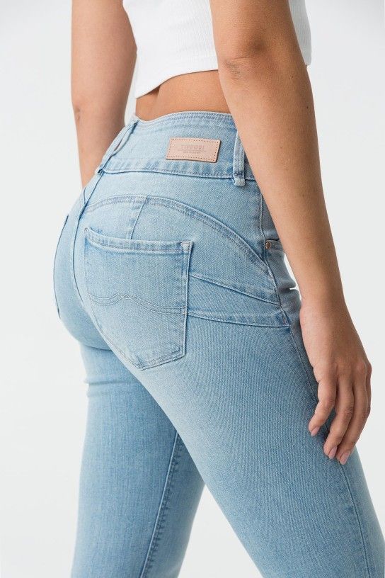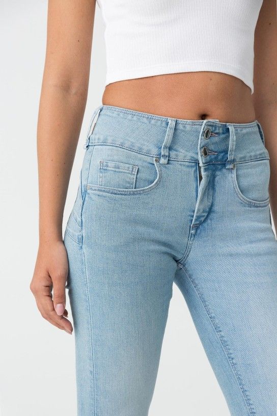 Vaqueros acampanados de tiro alto con cinco bolsillos. Cierre frontal de cremallera con botones metálicos. Efecto push-up y push-in. 93% CO 5% PES 2% EL