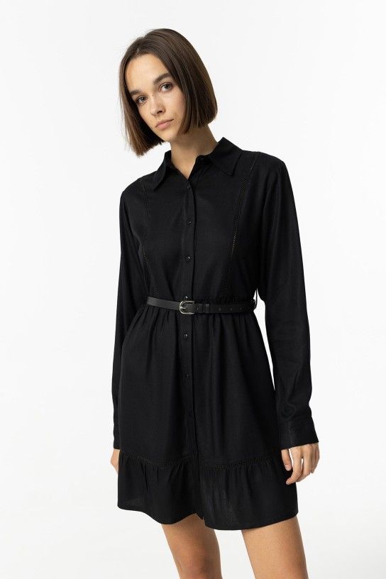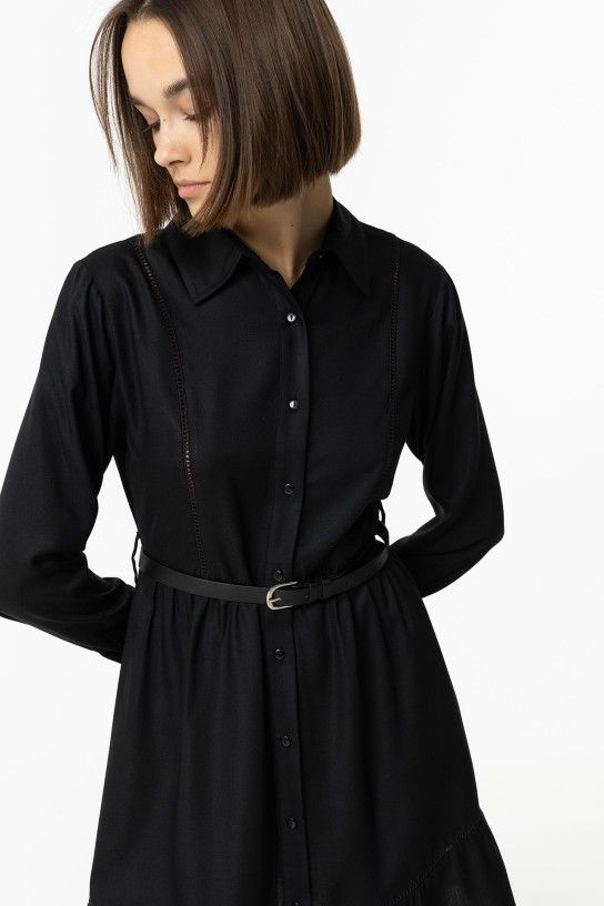 ¿Buscas el vestido perfecto para cualquier ocasión? Este vestido camisero negro para mujer de Tiffosi será tu mejor aliado. Su diseño atemporal con cuello solapa, cierre de botones y cinturón ajustable estiliza tu figura sin esfuerzo. Además, el detalle calado en el frente y el volante en el bajo lo convierten en una prenda única y femenina. ¡De esas que no pueden faltar en tu armario!